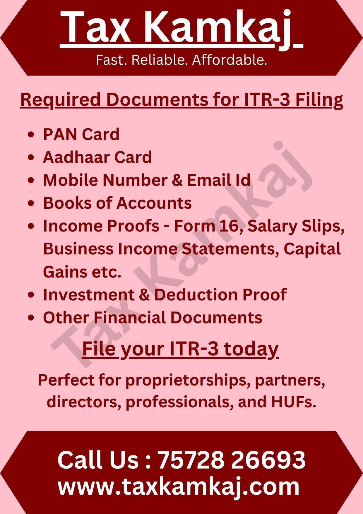 Looking for professional ITR-3 filing in Ahmedabad? We provide reliable, affordable and accurate income tax return filing services for business owners, freelancers and professionals.